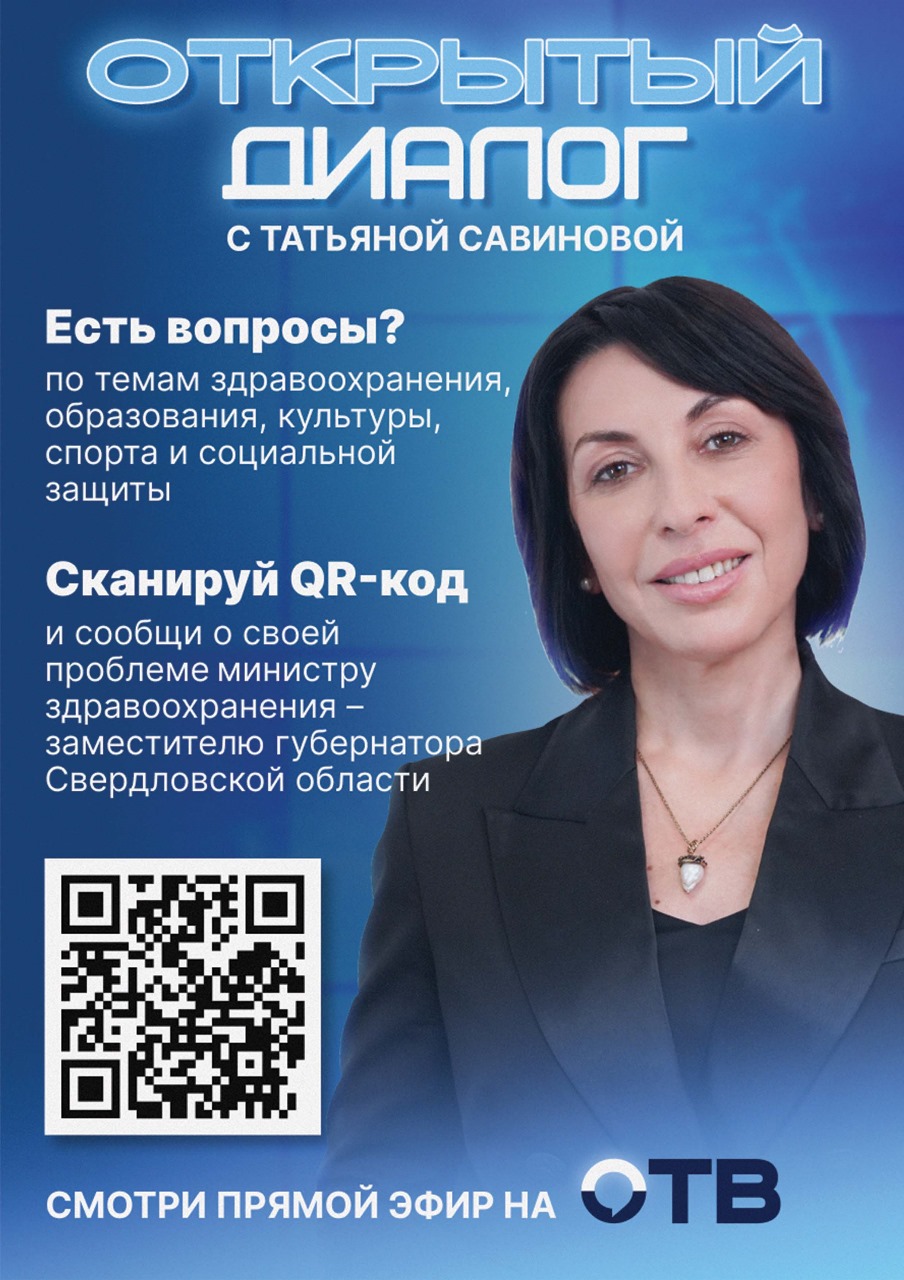 Министерство здравоохранения Свердловской области информирует о проведении прямого эфира с заместителем Губернатора Свердловской области – Министром здравоохранения Свердловской области Татьяной Леонидовной Савиновой для подачи вопроса на «Открытый диалог с Т.Л. Савиновой» воспользуйтесь QR-кодом для перехода на интерактивную анкету.